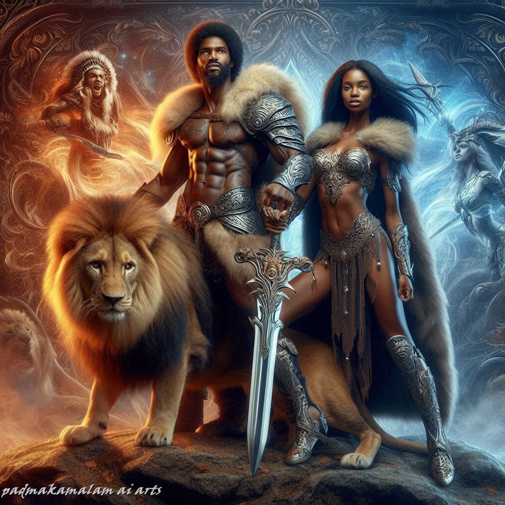 14. A muscular, male and female warriors with long dark hair, wearing fur-lined armor and wielding a large silver sword, along with her pet lion standing on top rock, ornate illusions in the background -Software Bing AI